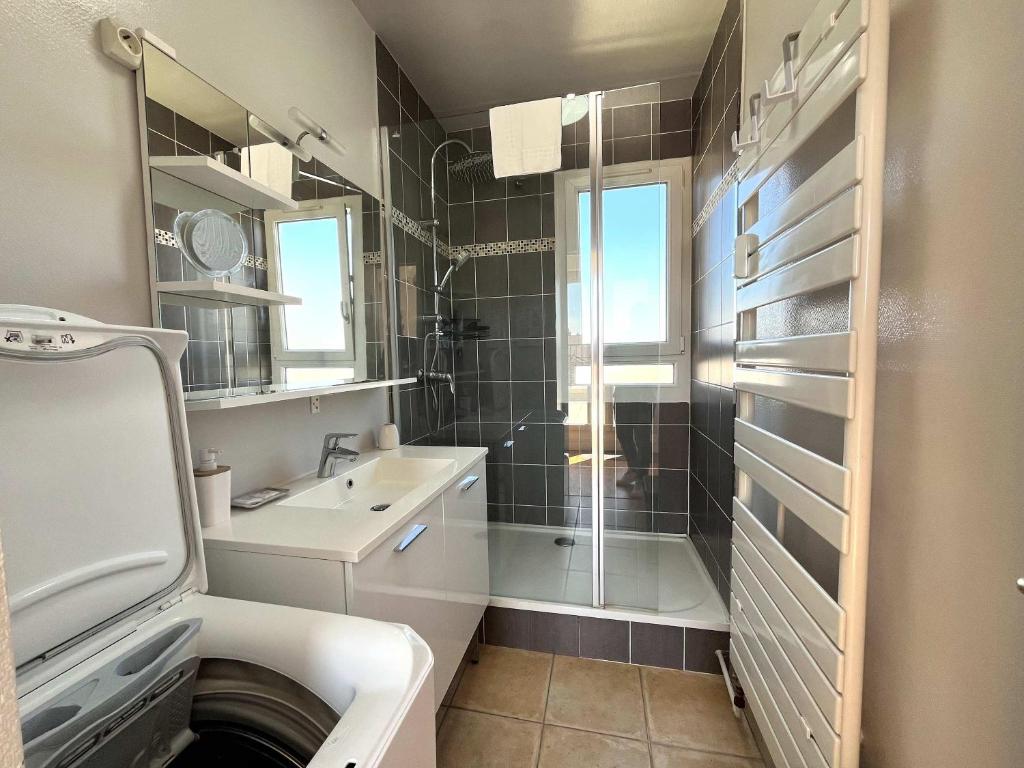 🛁 Une salle de bain avec une grande douche, lave-linge, sèche cheveux, WC séparé et indépendant.